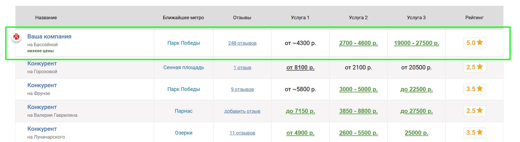 Вокруг продвигаемого таким образом автосервиса выбирается некоторое количество ближайших конкурирующих автосервисов, продвигаемый автосервис попадёт к ним в таблицу «Сравнение по ценам», которая выглядит следующим образом: